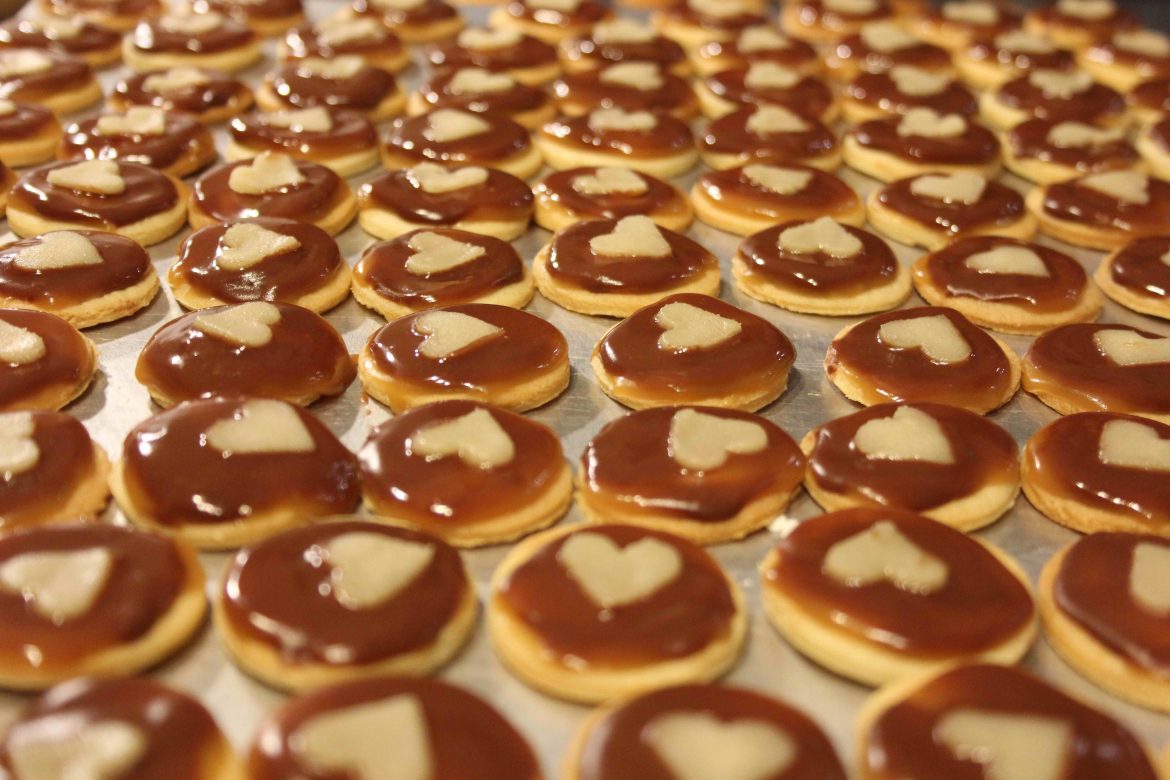 Mit einem Messer das kalte Karamell auf die Kekse streichen und etwas kaltstellen. Anschließend mit Schokolade bestreichen und ein dünn ausgewalktes Marzipan Herz auf die feuchte Schokolade setzten.