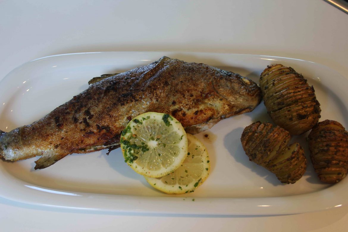 Für Fisch gilt die “ 3 S Regel“. D.h. säubern, säuern, salzen. Dann die ausgenommene Forelle mit viel frischer Petersilie füllen, zusätzlich mit etwas Fischgewürz verfeinern, und auf jeder Seite ca. 6 min in der Pfanne braten. Ich brate die Forelle gerne, weil ich den Geschmack sehr mag, in Butter und Olivenöl heraus. Aufpassen dass das Fett nicht zu heiß wird, da sonst die Butter verbrennt.