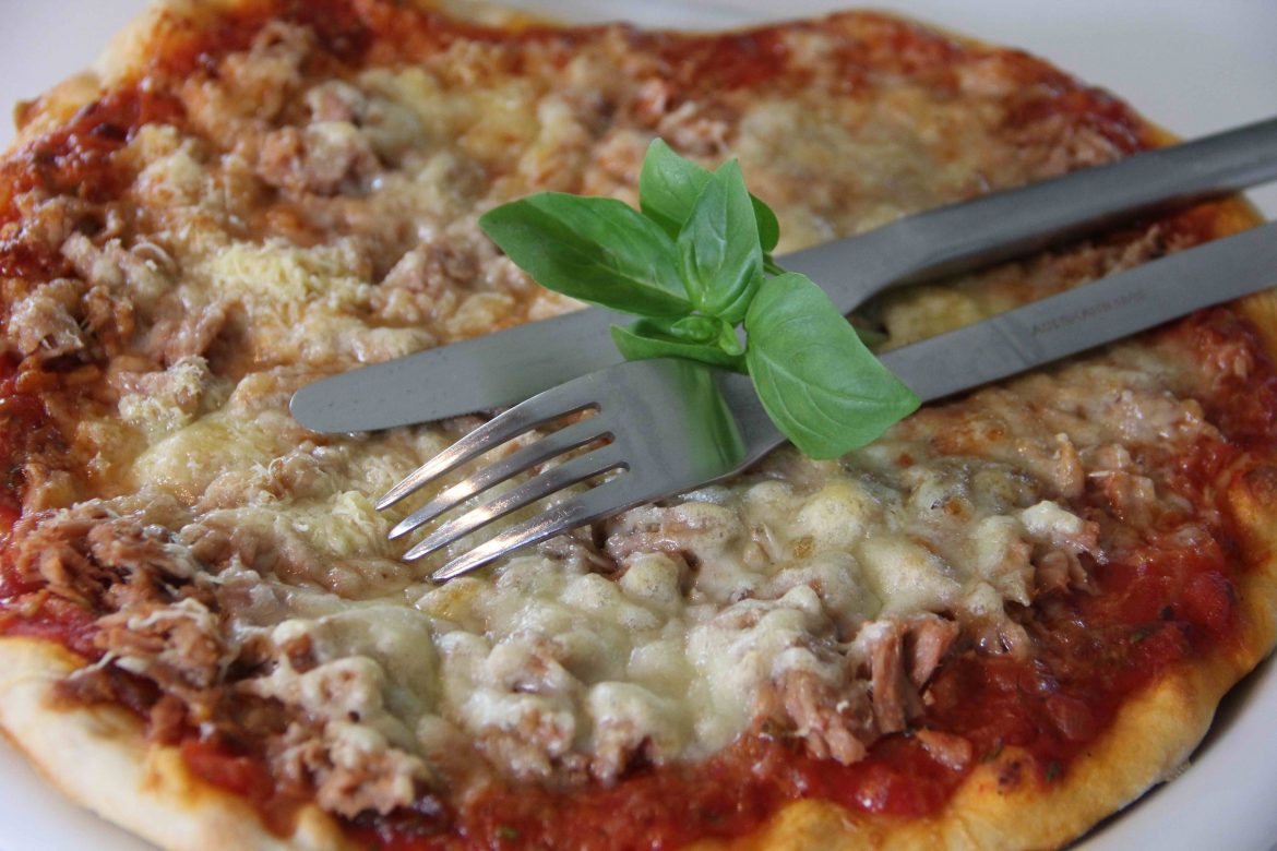 TEIG: BELAG: 250 g Bergkäse (10 Monate gereift) Als erstes bereite ich einen weichen Hefeteig zu. Ich lass ihn mindestens eine Stunde ruhen und gehen. Nach einer halben Stunde dehne und falte ich den Teig. Das Backrohr mit dem Stein auf 270° Ober und Unterhitze aufheizen. Ich backe die Pizza immer auf der untersten Schiene! In der Zwischenzeit verfeinere ich die Tomatensauce indem ich Zwiebel fein hacke, und in etwas Olivenöl glasig anlaufen lasse. Knoblauch ebenfalls. Tomatensauce und frische Kräuter dazu und gut abschmecken. So lange köcheln bis die Zwiebeln etwas weich sind (20-30 Min). Dann den Teig in drei Teile teilen und jeden Rund auswalken, auf ein Backpapier geben und dort belegen. Ein Drittel der Tomatensauce drauf, mit einem Drittel des abgetropften Thunfisch bestreuen und viel Käse drauf. www.dahoamschmecktsambesten.at