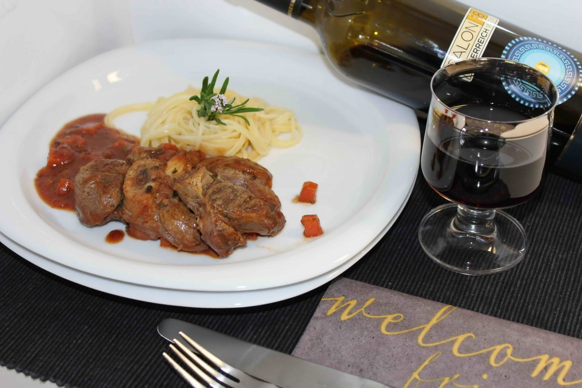 Die Fleischscheiben in einer Pfanne mit Olivenöl scharf anbraten und herausnehmen. In würfel geschnittene Karotten, Zwiebel, Sellerie, Knoblauch in der Pfanne kurz anrösten, mit Rotwein und Tomatensauce aufgießen. Die Kräuter und die geschnittenen Tomaten dazu und mit Salz und Pfeffer pikant abschmecken. Die angebratenen Fleischscheiben dazulegen und 1 Std. langsam auf niederer Stufe auf dem Herd köcheln, bzw. ziehen lassen. Ich habe dazu Spagetti Nudeln gekocht.
