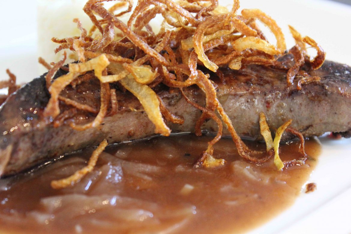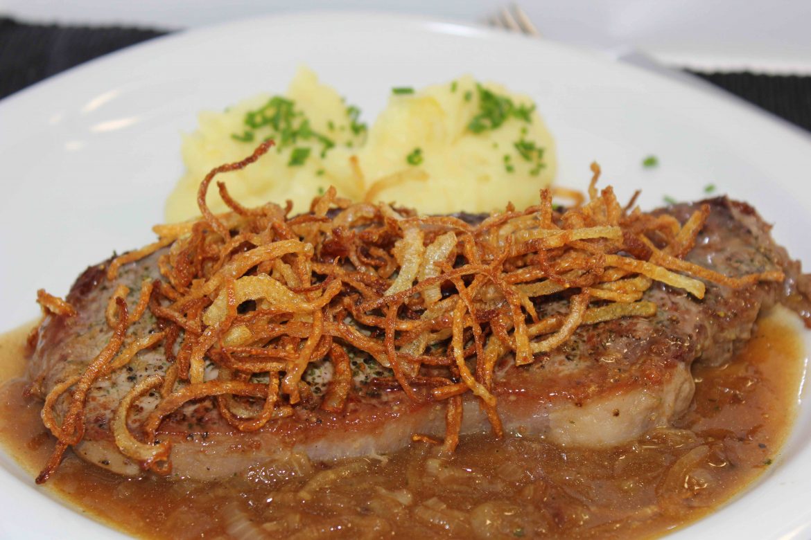 Den Rostbraten auf jeder Seite zwei Minuten anbraten, und kurz zur Seite stellen. Die vorbereitete Zwiebelsauce in die Pfanne geben, kurz aufkochen lassen, die abgebratenen Rostbraten hineinlegen und den Herd ausschalten. Das Fleisch noch eine Minute ziehen lassen. Das fertige Fleisch mit der Sauce und den Knusperzwiebeln anrichten.