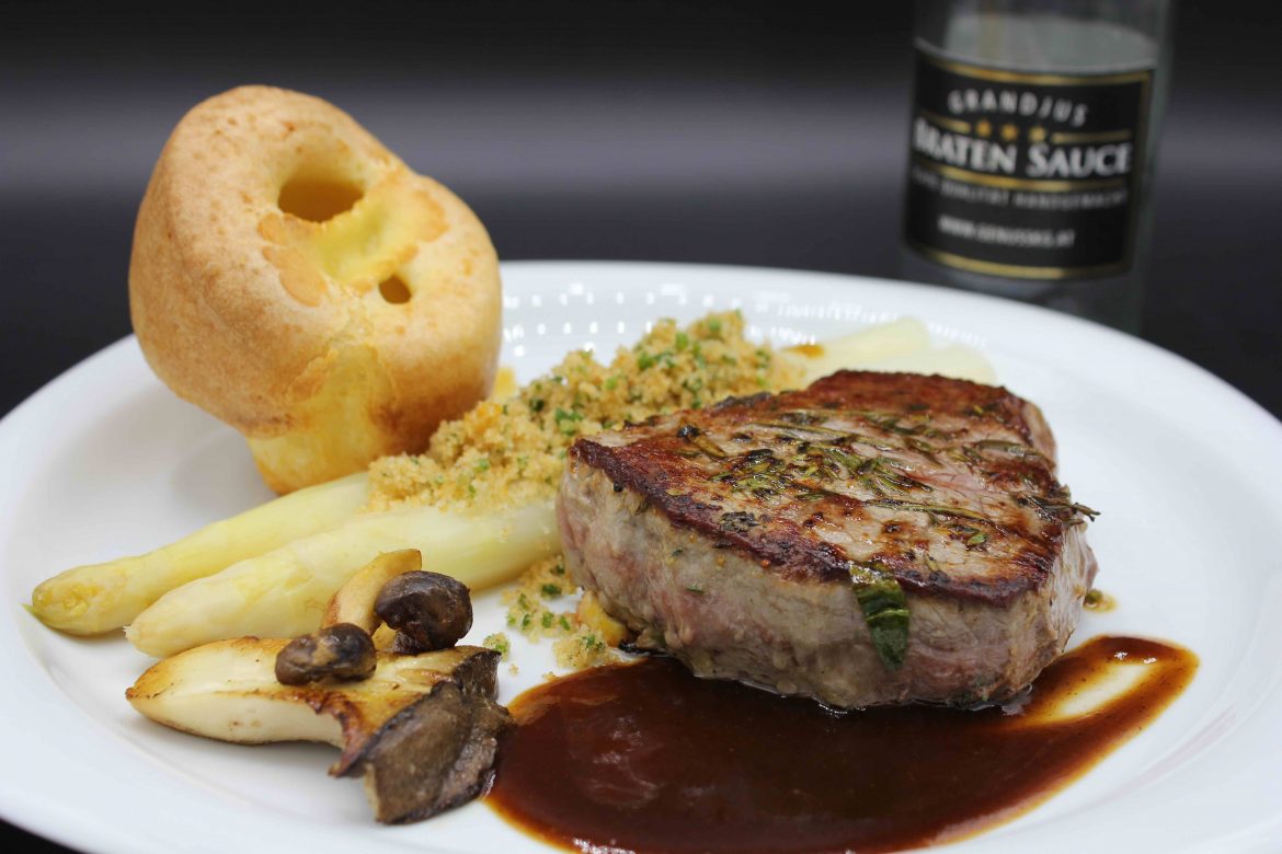 2 Rinderfilet Scheiben Heute durfte ich zum ersten Mal eine Braten Sauce der GenussKG aus Dornbirn auf den Tisch zaubern. Für mich die Beste Braten Sauce überhaupt die ich probiert habe. Die Sauce ist OHNE Geschmacksverstärker. Dies ist mir, wenn ich ein fertig Produkt kaufe, sehr sehr wichtig. Natürliche Inhaltsstoffe, 48 Stunden eingekocht, lassen bei dieser Sauce keine Wünsche offen. Mit dieser Sauce habt ihr ein perfektes Startprodukt das gleich verwendet werden kann. Ich habe diese Sauce mit einem Schuss Whiskey verfeinert. Hier sind euer Phantasie keine Grenzen gesetzt. Ob Sahne, Rotwein, Preiselbeer, Schokolade, Pilze…… alles kann dieser wunderbaren Sauce beigemischt werden. Auf der Homepage dieser Firma findet ihr viele tolle Ideen und Rezepte wie ihr diese Sauce weiter veredeln könnt. Das kleines Team (Charly + Kosta) haben sich der perfekten Sauce verschworen. Aus einem genialen Grundgerüst lässt sich noch was genialeres fertig zaubern. Eine Sauce wie in der Gourmetküche. Erhältlich ist diese Geschmacksexplosion im https://gnuss.at/ Danke liebe Marion Gohm für diese Kostprobe! Für den Pudding: Als erstes das Fleisch würzen mit Salz und Pfeffer und den frischen Kräutern. Mit Öl beträufeln und ziehen lassen. Herzlichen Dank noch einmal Marion Gohm! www.dahoamschmecktsambesten.at