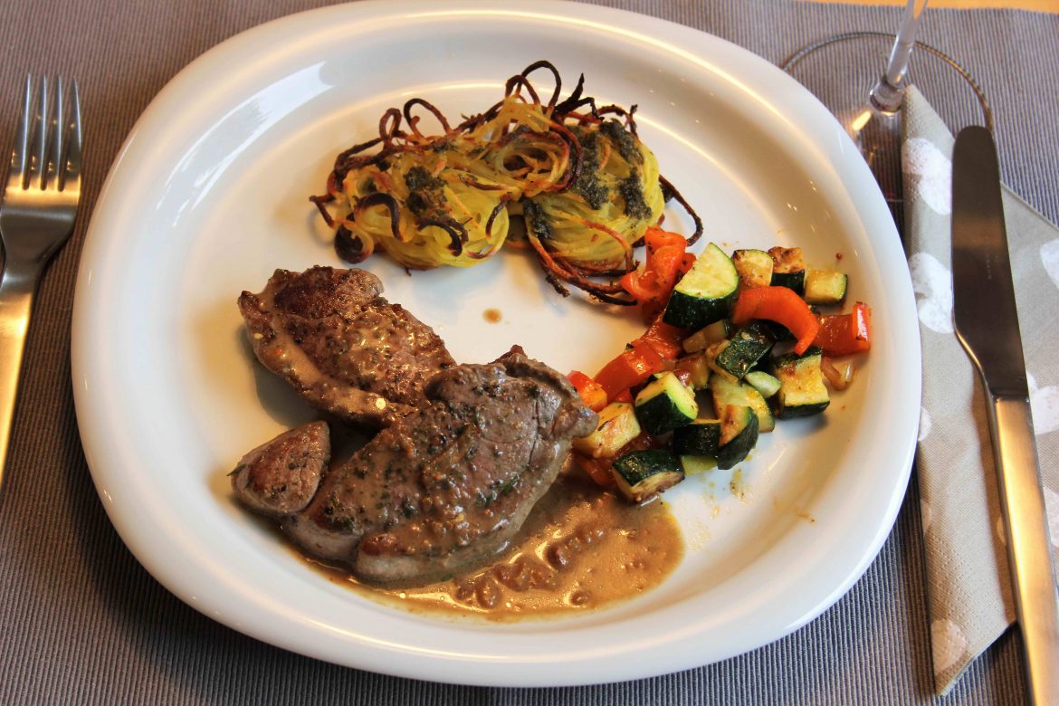 Kalbschnitzel (Florentiner Art) mit Kürbis-Pommes