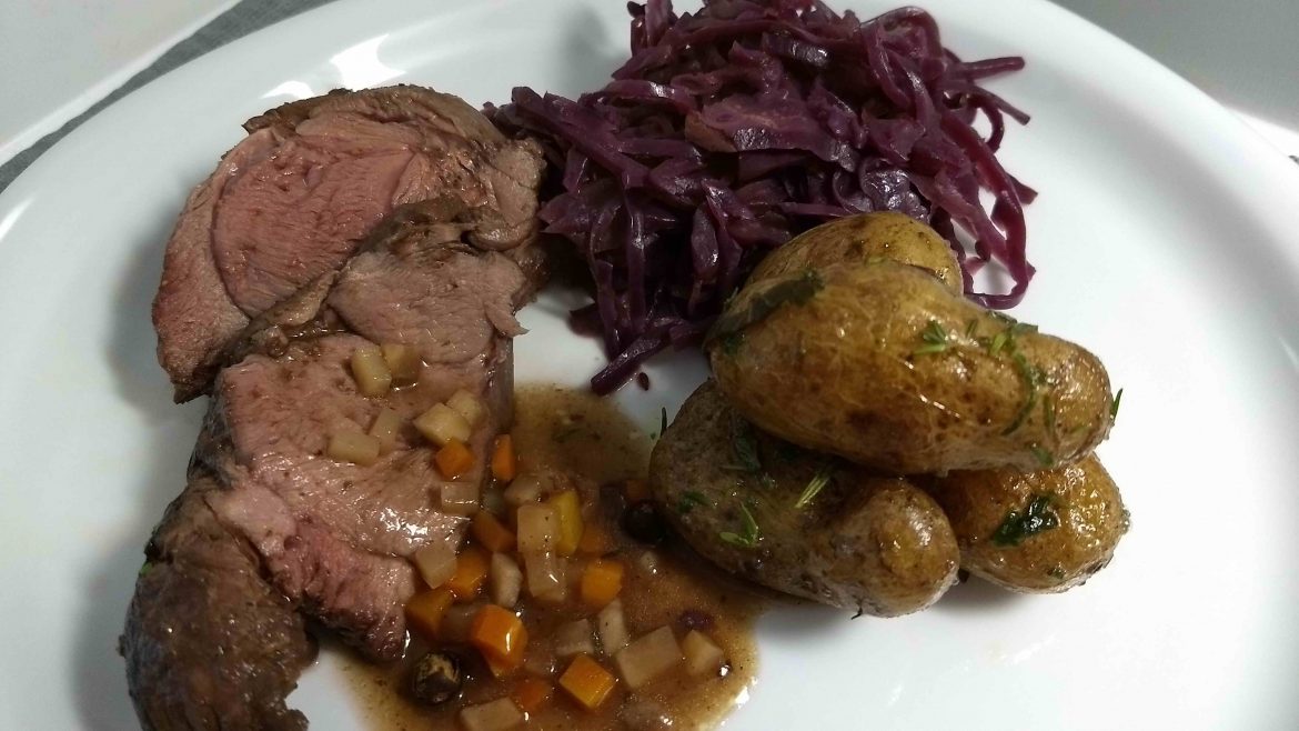 Da ich eigentlich kein großer Wildfleischfan bin, achte ich darauf dass ich nur Junges Wildfleisch bekomme, und lege es darum auch nicht in eine Beize. Den Schlögel würze ich mit Salz und Pfeffer und brate ihn auf allen Seiten scharf ab. Ich lege das Fleisch auf die Seite und gebe in die heiße Pfanne einen El. Mehl und schwitze ihn dunkel an, und gieß mit Rotwein und Wasser auf. In die Sauce gebe ich die klein würfelig geschnittenen Karotten und Selleriewürfel. Ich würze mit Salz und Pfeffer und gebe die Preiselbeermarmelade, Wacholderbeeren und das Lorbeerblatt dazu. Dann nicht vergessen das Fleisch wieder hineinzulegen. Ein Stück dunkle Schokolade gibt dem Fleisch und der Sauce einen guten Geschmack. Ich lass das Fleisch ca. 1/2 Std auf dem Herd köcheln, oder im Backrohr bei 180° ca. eine halbe Stunde!