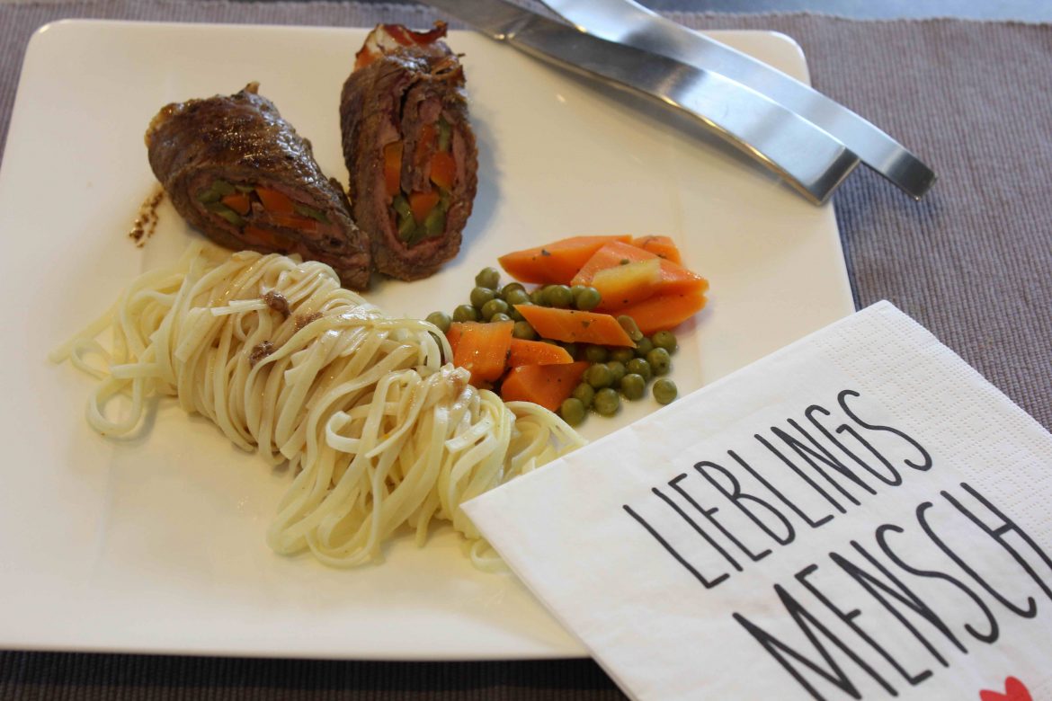 6 Rindschnitzel Die Rindschnitzel werden vorsichtig mit einem Fleischklopfer geklopft! Auf beiden Seiten mit Salz, Pfeffer und frisch gemahlenen Senfkörnern gewürzt. Karotten stiftelig schneiden, Essiggurken ebenfalls! Jedes Schnitzel wird mit Kalbsbrät bestrichen, mit Speck, Gurken und Karotten belegt und vorsichtig eingerollt! Mit Zahnstocher oder Küchengarn fixieren. Ein Tipp von mir….nehmt für jede Roulade gleich viel Zahnstocher. Ich habe mal vor lauter Gier einen mitgegessen. www.dahoamschmecktsambesten.at