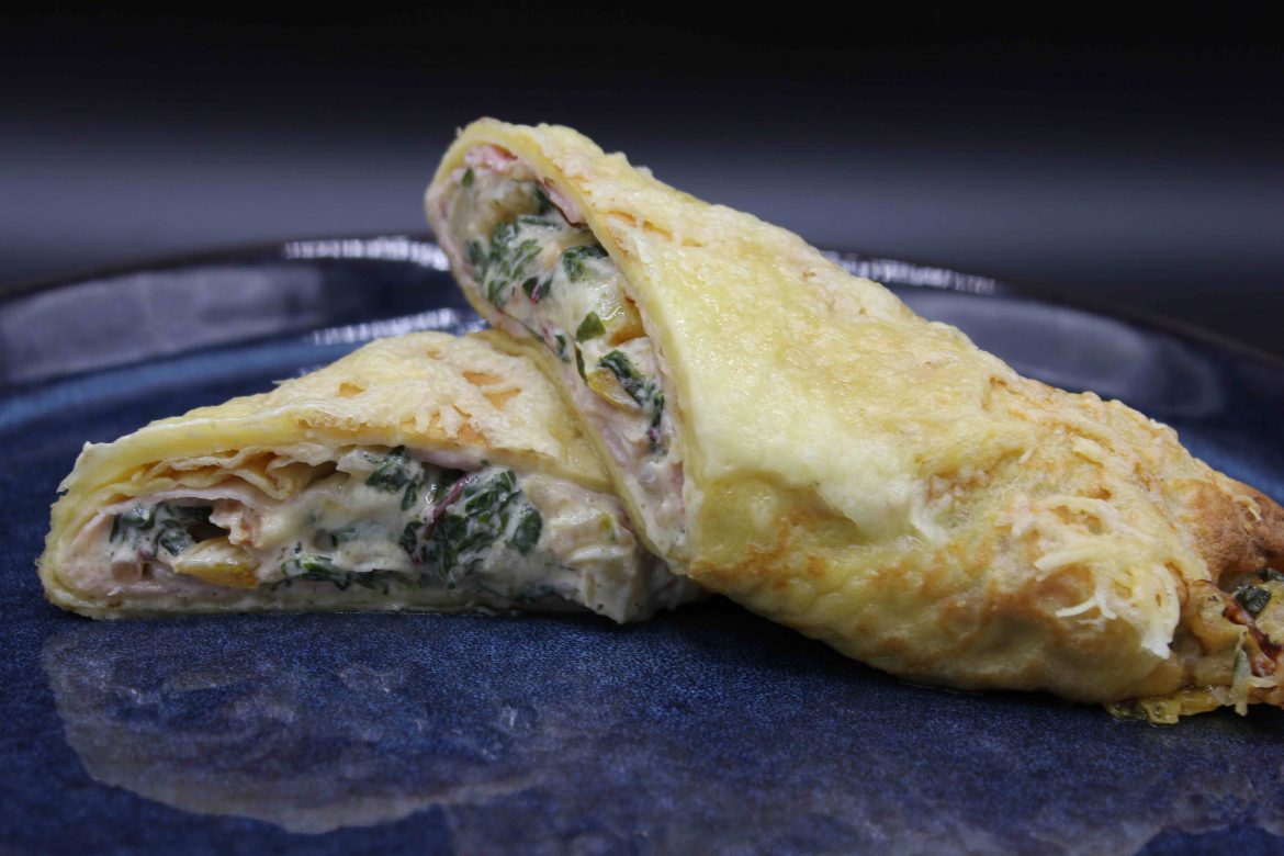 Für die Gemüsefüllung die Zwiebel ringelig, Mangold in 2 cm breite Streifen – Stängel etwas dünner, Kohlrabi und Zucchini in feine Stifte schneiden. Käse fein reiben und beide Sorten vermischen. Zwiebel in etwas Butter glasig anlaufen lassen und das ganze geschnittene Gemüse mit rösten bis der Mangold zusammengefallen ist. Philadelphia dazu und pikant abschmecken. Die Fülle vom Herd nehmen. Die Fülle in vier Teile teilen und auf jede Palatschinke eine Scheibe Schinken, Gemüsefülle und etwas geriebener Käse geben und einrollen. Die vier gefüllten Palatschinken nebeneinander in ein gefettete Auflaufform legen und mit dem restlichen Käse bestreuen. Bei 220 Grad Heißluft überbacken. Dazu passt sehr gut grüner Salat. Die Palatschinken können auch vegetarisch zubereitet werden. Dann lass ich einfach den Schinken weg.