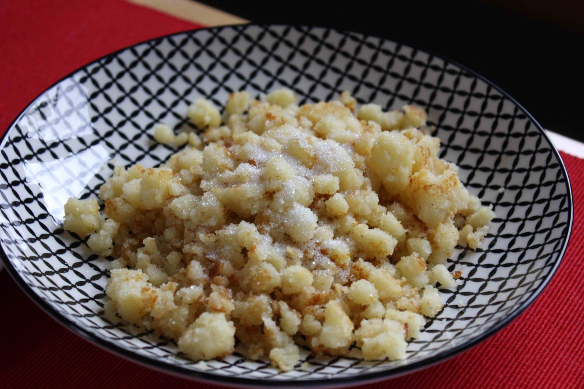 Dies ist Riebel mit Zucker und Apfelmus! Hier wird Riebel als Süßspeise gegessen. Viele Menschen essen dann noch zur Krönung Käse dazu! Süß mit Käse und Apfelmus…… huiiii das ist schon für viele zu viel des Guten! Meist auf Alpen und Bauernhöfen wird er zum Frühstück serviert. Da kann man den Riebel am Vorabend einkochen und am Morgen in der Früh anrösten. Hier darf der Kaffee oder die Milch dazu nicht fehlen! Es darf auch eingetunkt werden!