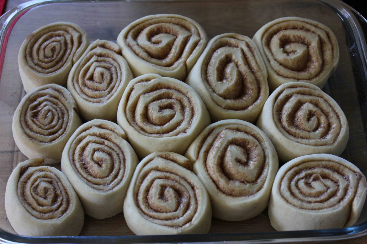Teig auf der leicht bemehlten Arbeitsfläche zu einem Rechteck ausrollen. Für die Füllung die weiche Butter, Zucker und Zimt mit dem Mixer aufschlagen. Die Zimtbutter dünn auf das Rechteck aufstreichen und von der langen Seite her aufrollen. Ca. 6 cm breite Stücke abstechen und in eine befettete (Öl oder Butter) Form setzten. 45 bis 60 min zugedeckt gehen lassen.