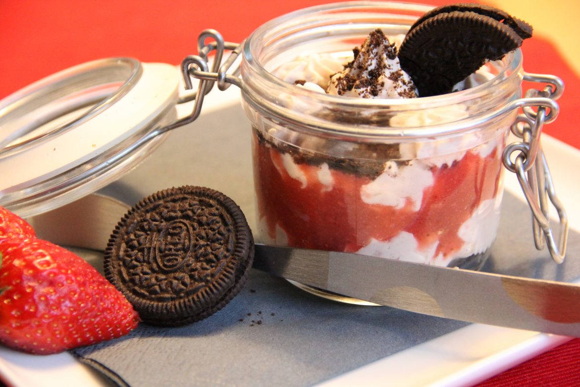 6 Oreo Kekse in einen Tiefkühlbeutel mit einem Nudelwalker zerkleinern und die Krümel in die Gläser füllen, sodass der Boden bedeckt ist. Mascarpone Creme drauf und dann pürierte Erdbeeren. Dieses so lange wiederholen wie ihr in den Gläsern Platz habt. Mit Mascarpone Creme abschließen und zur Dekoration ein halbes Oreo Keksle drauf.