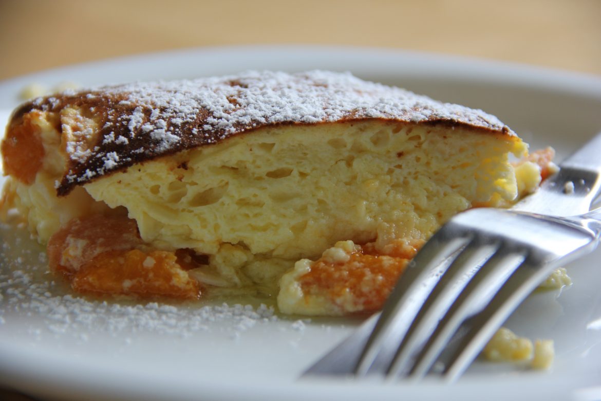 Auflaufform einfetten und die Halbe Masse unterheben, Früchte drauf, und dann die zweite Hälfte der Topfenmasse. Früchte sind aber kein „muss“! Schmeckt auch ohne sehr gut!