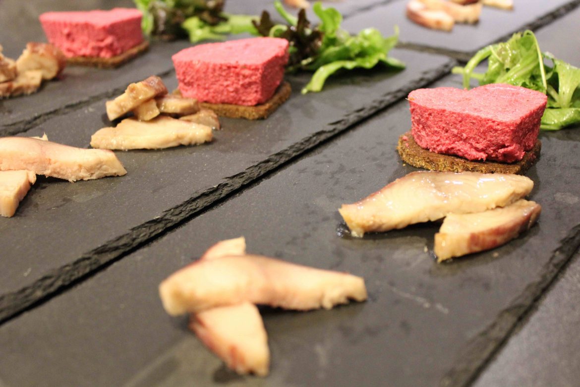 Schlagobers steif schlagen. Gelatine in einem Löffel Wasser auflösen und unter die pürierte Masse rühren. Am besten mit dem Mixer damit es keine Klumpen gibt. Topfen und Schlagobers unterrühren und noch einmal pikant abschmecken. Die Masse in kleine Förmchen geben und mindestens 4 Stunden im Kühlschrank fest werden lassen. Ich habe dann ungefähr gleich große Stücke Pumpernickel ausgeschnitten wie die Silikonförmchen. Bild siehe Slider. Das festgewordene Mousse habe ich dann auf den Pumpernickel gestürzt und ich habe es oben auf dem Bild mit zwei Stück kaltem geräucherten WELS angerichtet. Daneben habe ich ebenfalls zwei Stücke geräucherten WELS aber leicht angebraten angerichtet. Dies ist eine sehr feine Vorspeise. Das Rote Bete Mousse ist auf den ersten Bissen mal was ganz anderes, aber hat zu Weihnachten der ganzen Familie sehr geschmeckt. Empfehlenswert!