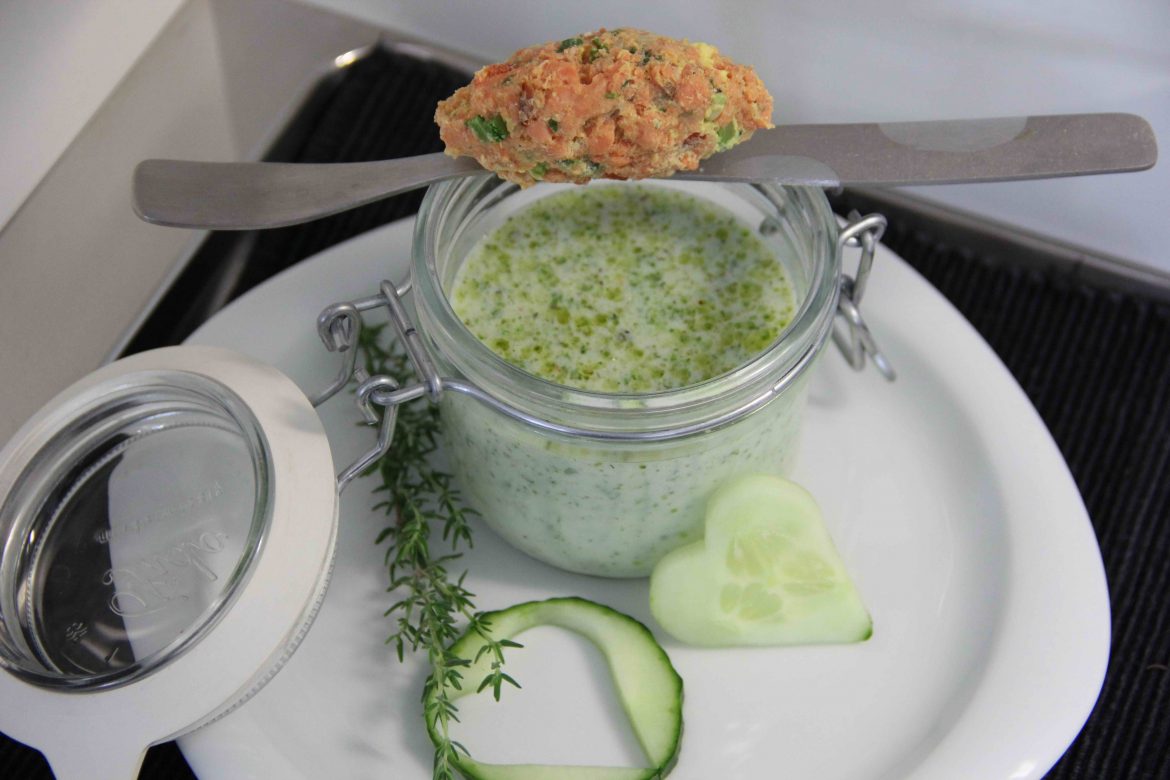 SUPPE: 500 ml Buttermilch RÄUCHERLACHSNOCKERL: 150 g Wildräucherlachs Für die Suppe die Gurke waschen, aber nicht schälen. Zusammen mit dem Olivenöl und den Kräutern und Gewürzen – mit dem Mixstab sehr fein pürieren. Mit einem Schneebesen die Buttermilch unterrühren und noch einmal pikant abschmecken. Sie darf ruhig ein kleines bisschen an Schärfe zeigen. www.dahoamschmecktsambesten.at