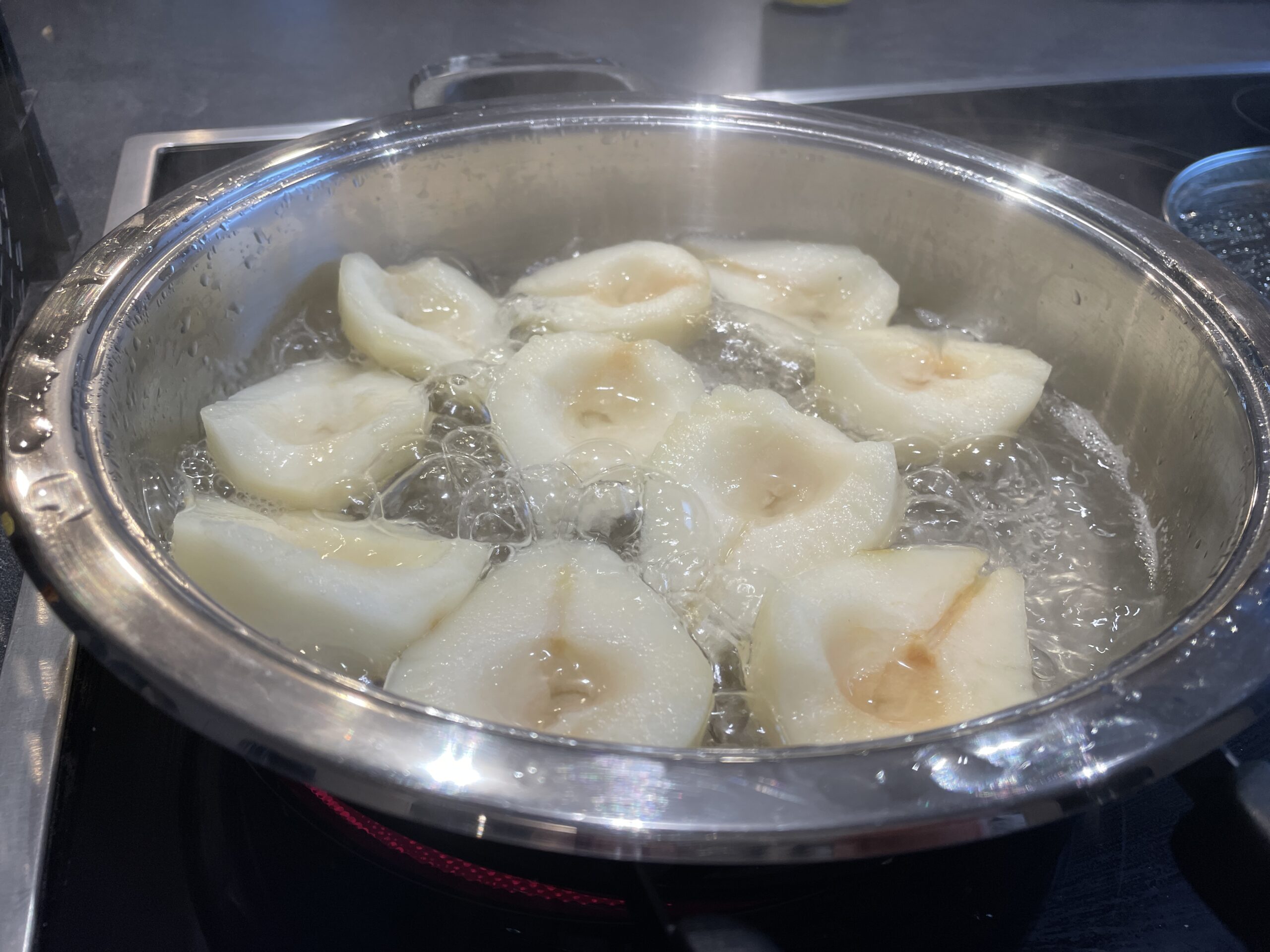 In der Zwischenzeit Birnen schälen, halbieren und in etwas Zuckerwasser weichdünsten.