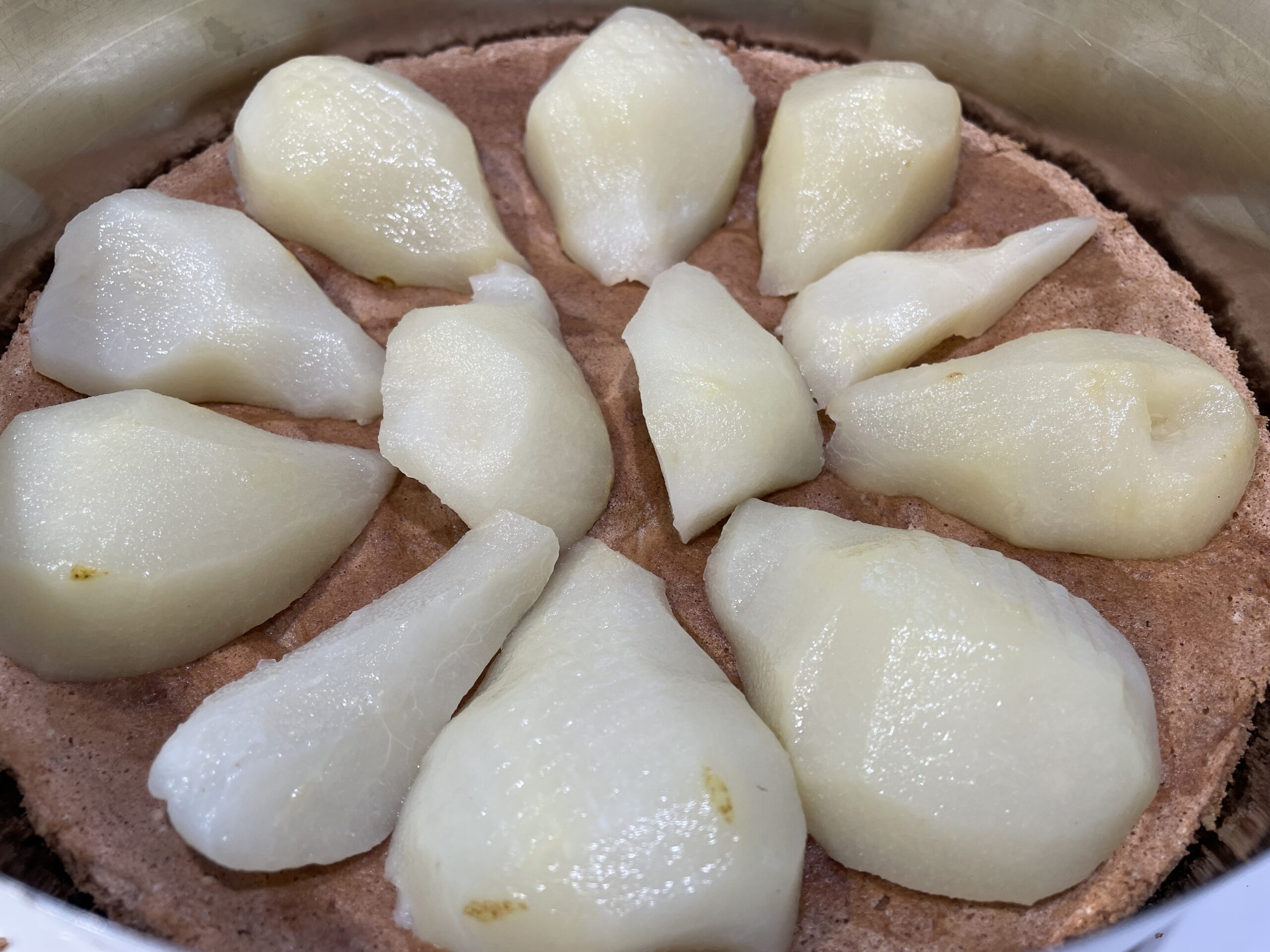 Birnen auskühlen lassen. Den kalten, getränkten Boden mit Birnen belegen. Entweder in Scheiben schneiden oder Birnenhälften auflegen.