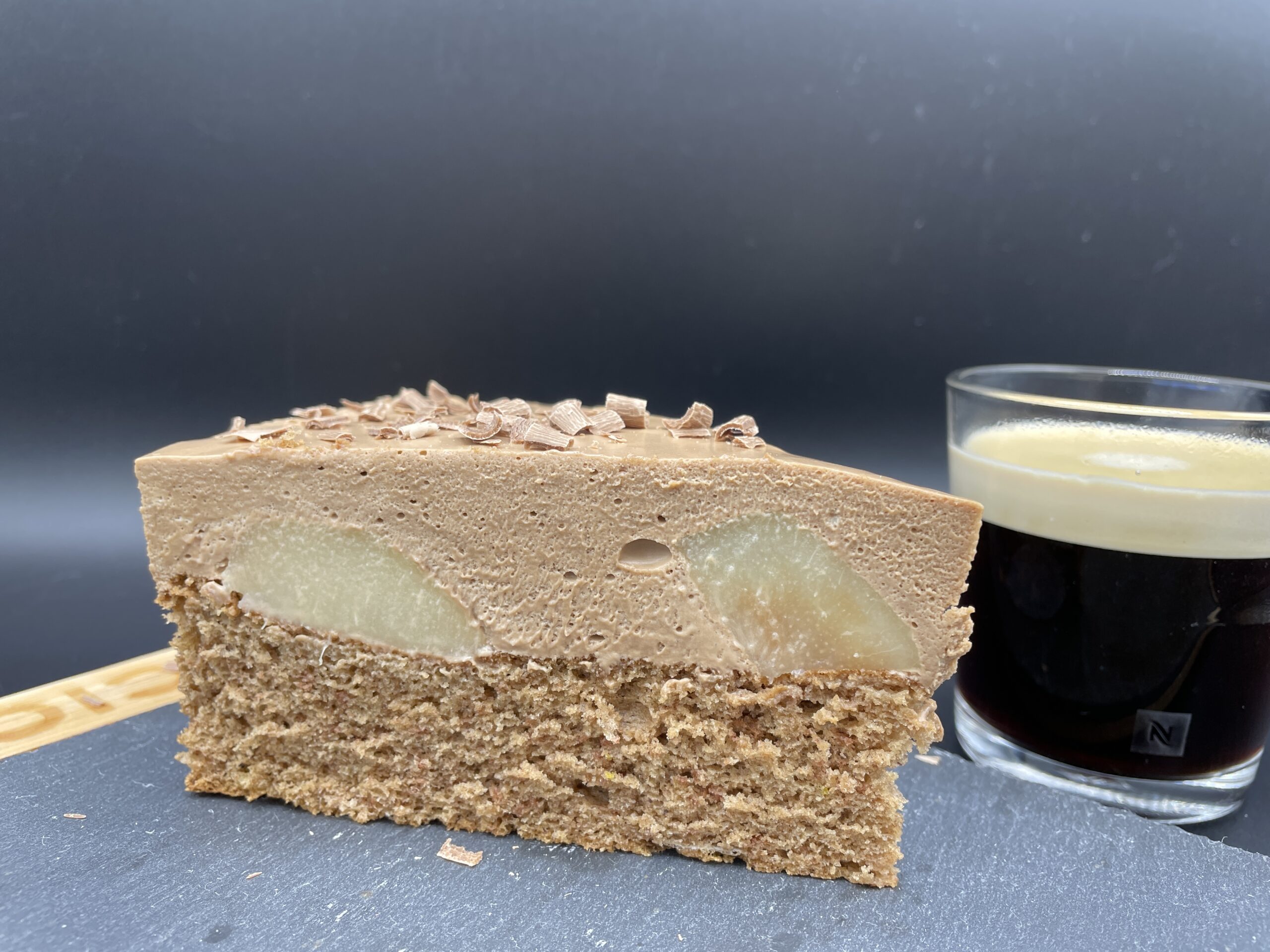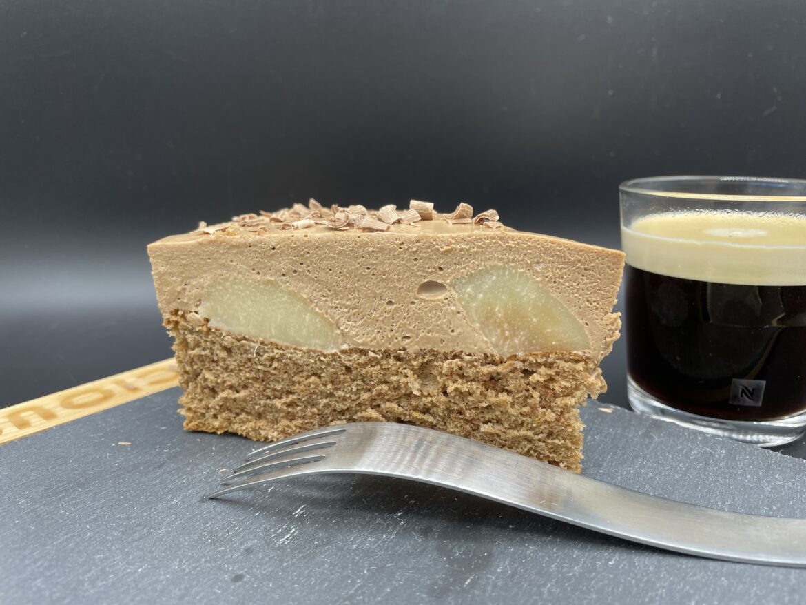 Den mit Birnen belegen Biskuit mit der Creme bestreichen, evtl. mit Schokoraspel verzieren.