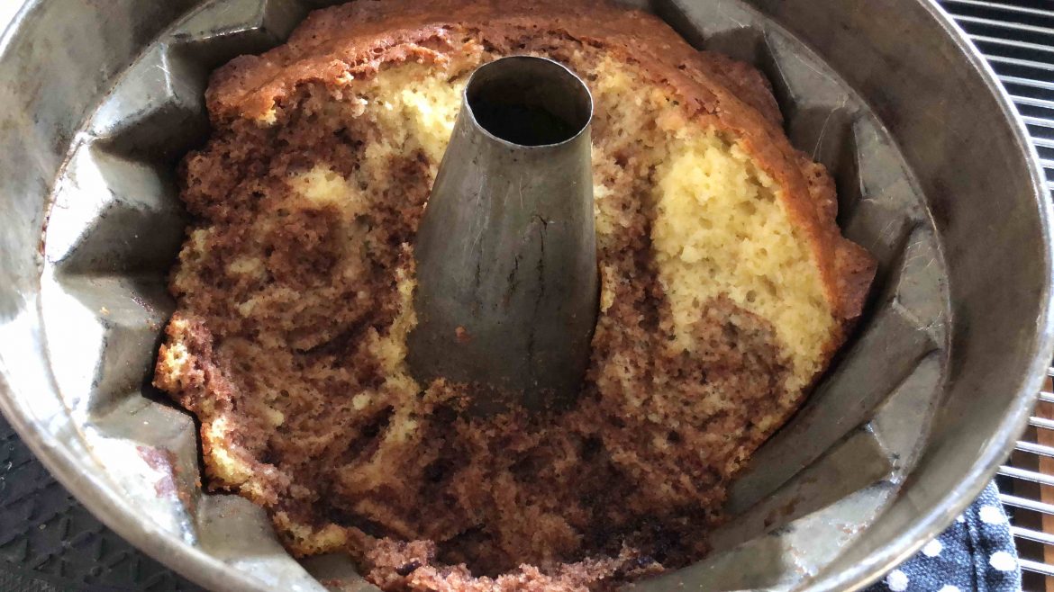 Eine Gugelhupf Form mit Butter ausstreichen und mit Mehl bestreuen. Die zwei Massen abwechselnd einfüllen und mit einer Gabel einmal durchfahren, dass sich die beiden Massen mit einem schönen Muster verbinden.