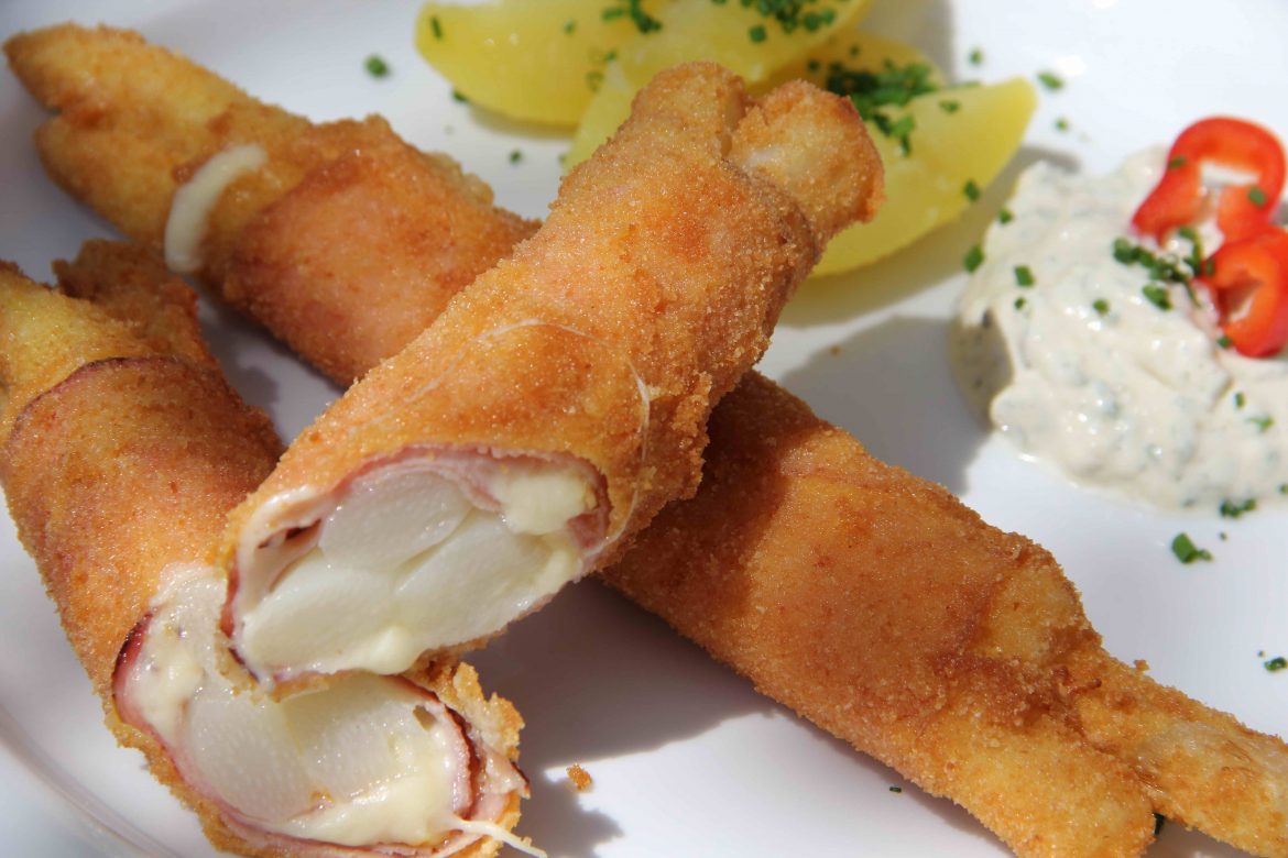 Die panierten Spargelrollen auf jeder Seite zwei Minuten herausbacken und noch heiß mit Kartofferl und Sauce Tartare servieren. Eine wunderbare Beilage zu den Spargel-Cordon-bleu!!